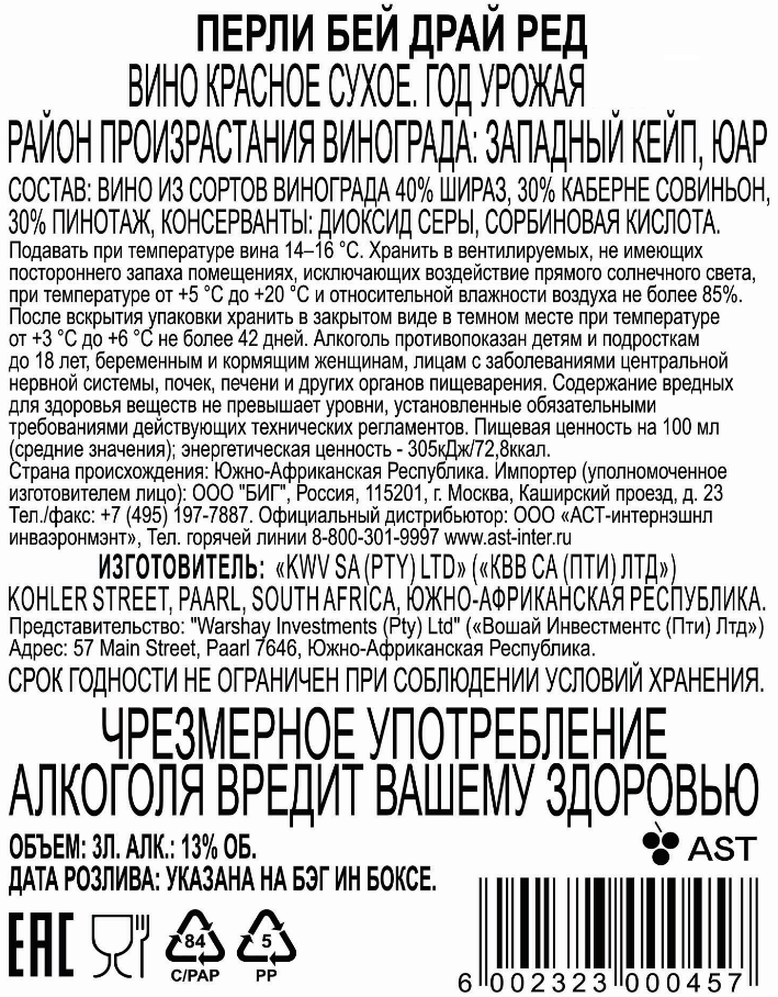Вино Pearly Bay красное сухое, 0,75 л - это южноафриканский купажный напиток, который создан для тех, кто отдает предпочтение зернистой текстуре и выразительной кислотности. Он прекрасно впишется в семейный ужин, вечеринку в компании друзей или праздничное застолье. Его характеризуют легкая насыщенность и крепость 14%. Для его изготовления используется виноград пяти сортов. Основой выступает сенсо, а дополняют его шираз, пинотаж, каберне совиньон и мерло. Виноградники разбиты на живописном побережье Южного Кейпа. В этой местности преобладает благоприятный средиземноморский климат и почвы с разнообразным составом. Благодаря этому создаются все необходимые условия для выращивания сочных и душистых плодов, с отменными сортовыми качествами. После созреванию урожай собирают, бережно обрабатывают и отправляют на винификацию. Каждый этап этого процесса проходит под строгим контролем ведущих энологов и технологов бренда. В результате получается вино красивого красного цвета с щедрым ароматическим букетом, который сочетает в себе оттенки дыма и нюансы смолы. Вкусовая палитра алкоголя привлекает внимание своей яркостью и оригинальностью, а также приятным продолжительным послевкусием. Напиток составит гармоничную гастрономическую пару с ризотто, блюдами из овощей и разнообразными пирогами. Его также можно употреблять отдельно от приема пищи, например, в качестве дижестива. Перед сервировкой его рекомендуется охладить.