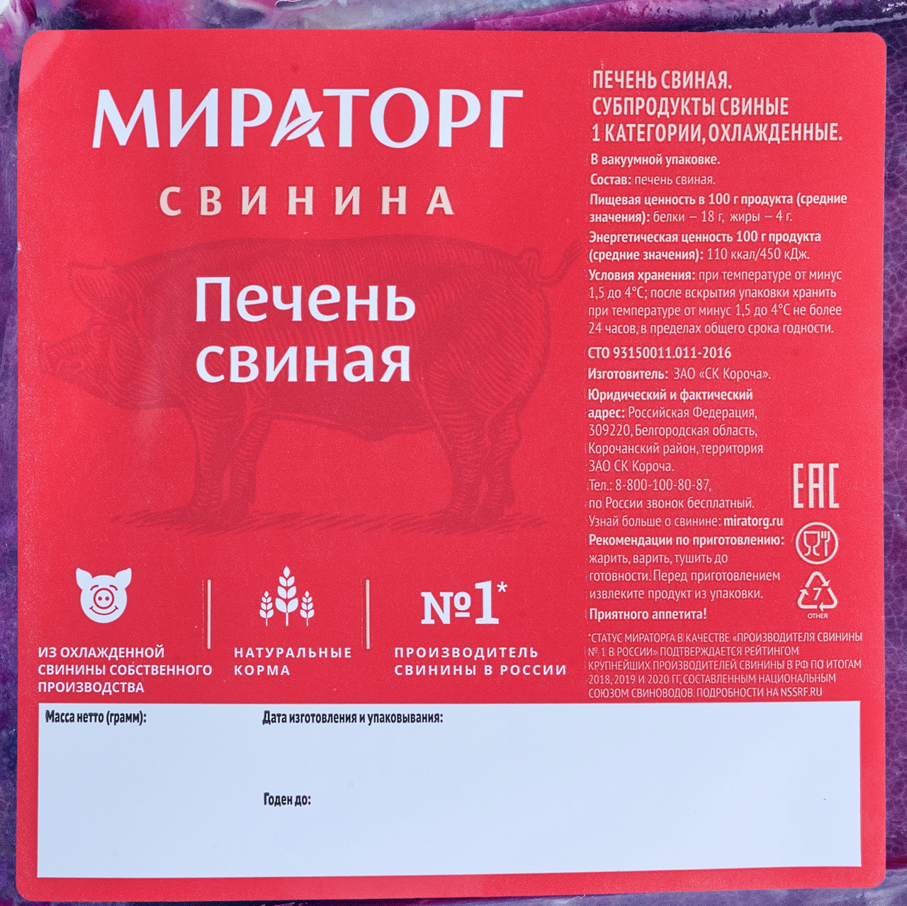Свиная печень богата витаминами, незаменимыми аминокислотами и микроэлементами. Вкус у нее нежный, с легкой горчинкой и сладковатым ароматом. Чтобы сохранить свежий вкус и максимум полезных веществ, мы замораживаем ее по собственной технологии шоковой заморозки и используем уникальную упаковку.