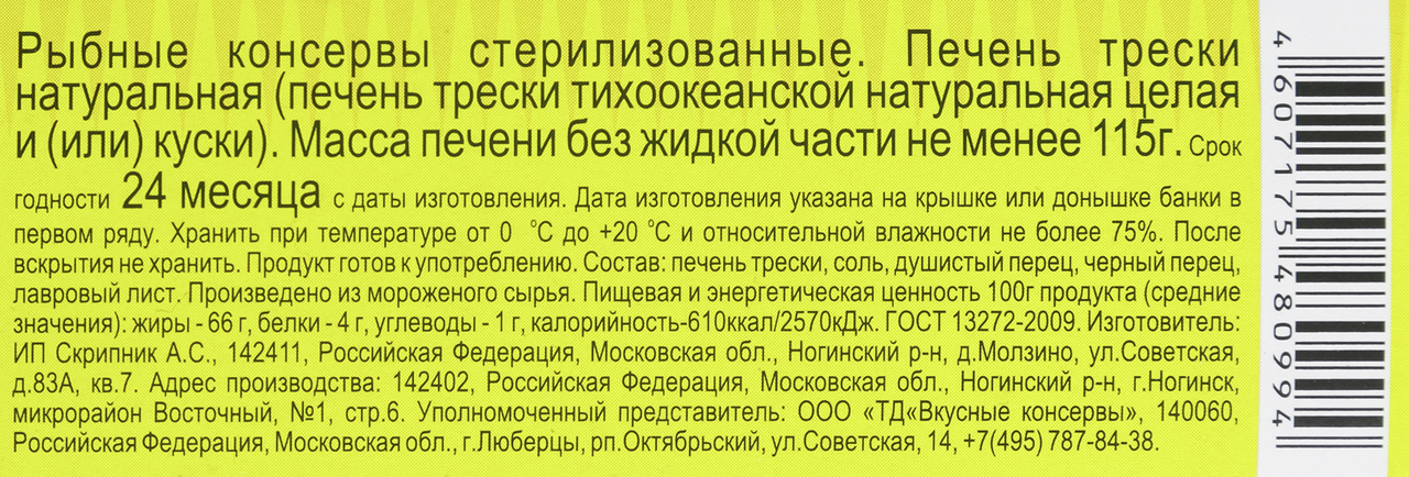 Печень трески Вкусные консервы, 230г – это натуральный продукт, который не содержит ГМО, красителей и других синтетических добавок. Печень трески является деликатесным продуктом и несет в себе комплекс веществ, незаменимых для человеческого организма. Она обогащена витаминами D, A и B2, а также Омега-3 ненасыщенные жирные кислоты, которые повышают продолжительность жизни.