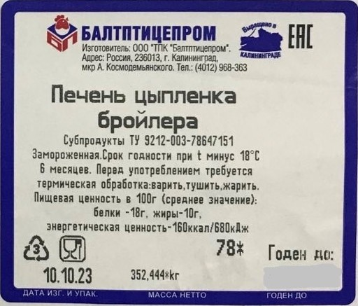 Печень цыпленка-бройлера Балтптицепром замороженная, ~450г