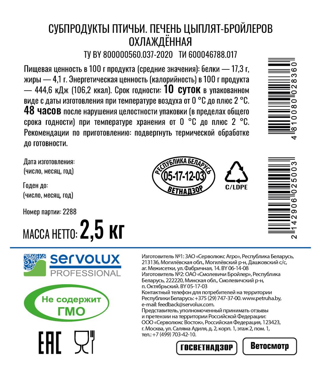 Печень цыпленка-бройлера Servolux Professional охлажденная, ~2.5кг