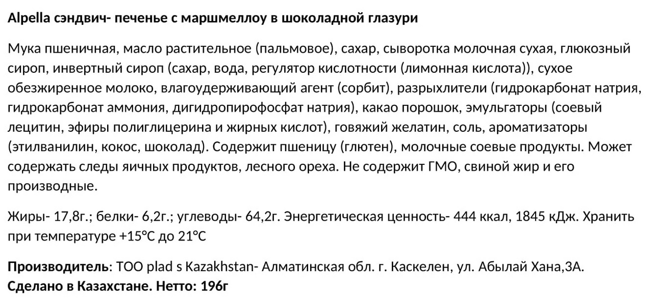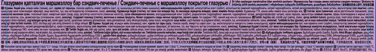 Мука пшеничная, масло растительное (пальмовое), сахар, сыворотка молочная сухая, глюкозный сироп, инвертный сироп (сахар, вода, регулятор кислотности (лимонная кислота)), сухое обезжиренное молоко, влагоудерживающий агент (сорбит), разрыхлители (гидрокарбонат натрия, гидрокарбонат аммония, дигидропирофосфат натрия), какао порошок, эмульгаторы (соевый лецитин, эфиры полиглицерина и жирных кислот), говяжий желатин, соль, ароматизаторы (этилванилин, кокос, шоколад).