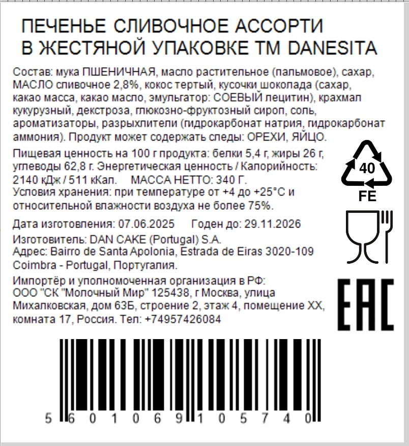 Мука пшеничная масло растительное (пальмовое), масло сливочное 2,8%, кокос тертый, кусочки шоколада (сахар, какао масса, какао масло, эмульгатор: соевый лецитин), крахмал кукурузный, декстроза, глюкозно-фруктозный сироп, соль, ароматизаторы, разрыхлители (гидрокарбонат натрия, гидрокарбонат аммония). Продукт может содержать следы: орехи, яйцо.