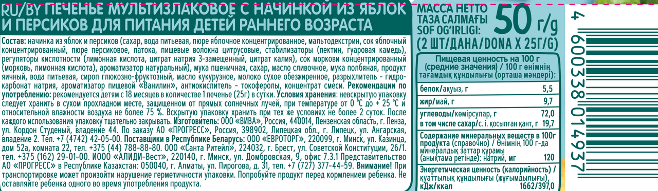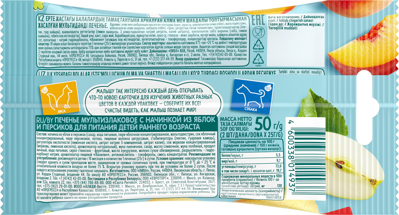 Печенье детское ФрутоНяня мультизлаковое яблоко и персик, 50г