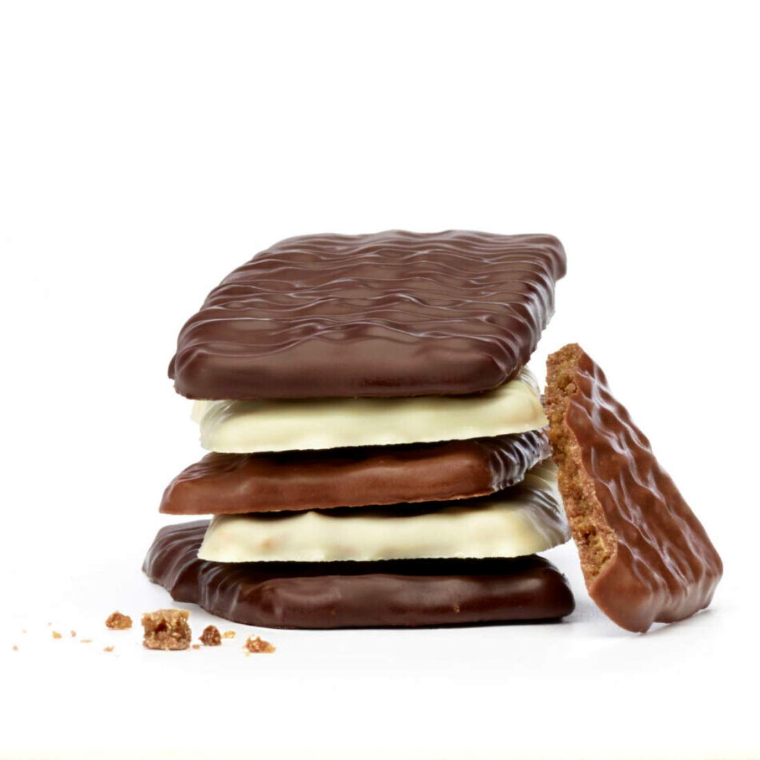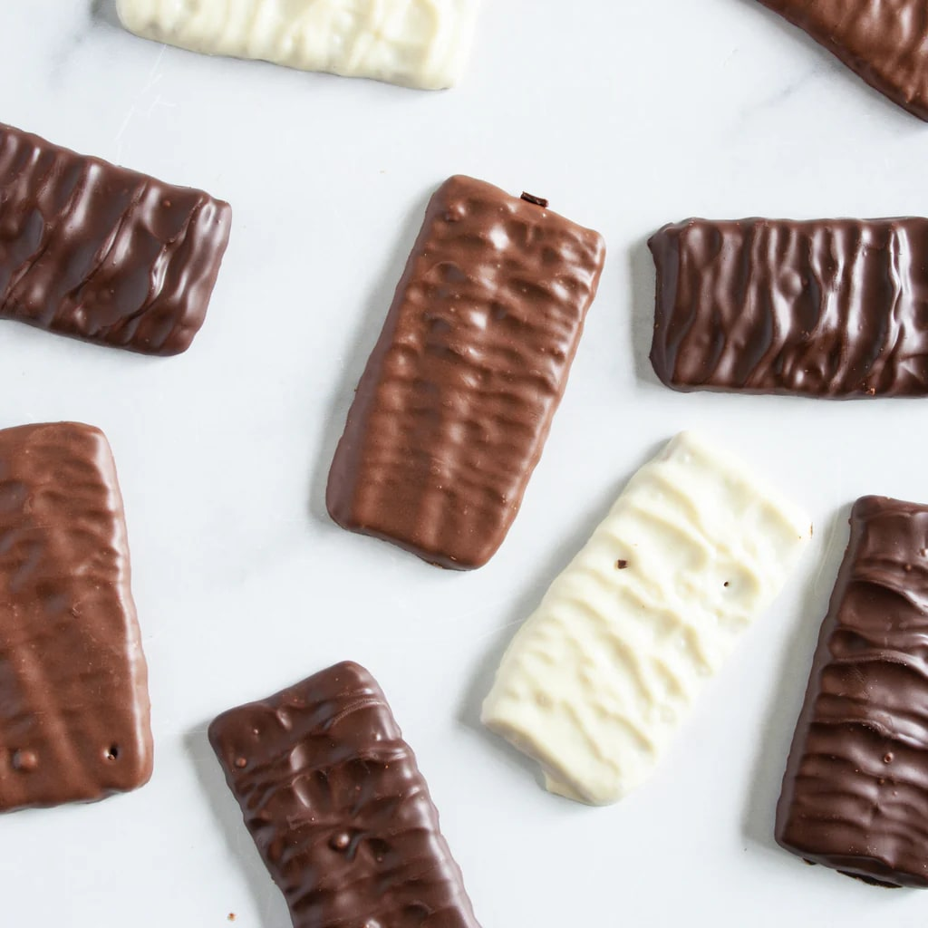 Хрустящие и тонкие печенья, обильно покрытые тремя сортами настоящего бельгийского шоколада (темным, белым и молочным). Каждый вид шоколада добавляет свой уникальный вкус: от богатого, слегка горьковатого до кремового с нотками карамели.