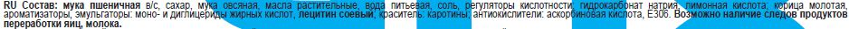 Мука пшеничная в/с, сахар, мука овсяная, масла растительные, вода питьевая, соль, разрыхлитель: гидрокарбонат натрия; корица молотая, эмульгаторы: моно- и диглицериды жирных кислот, лецитин соевый; ароматизаторы, регуляторы кислотности: гидрокарбонат натрия, лимонная кислота; краситель: каротины; антиокислители: аскорбиновая кислота, альфа-Токоферол. Возможно наличие следов продуктов переработки яиц, молока.