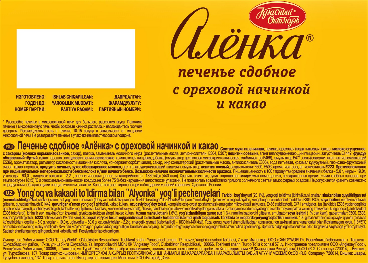 Печенье Красный Октябрь Аленка с ореховой начинкой и какао, 200г