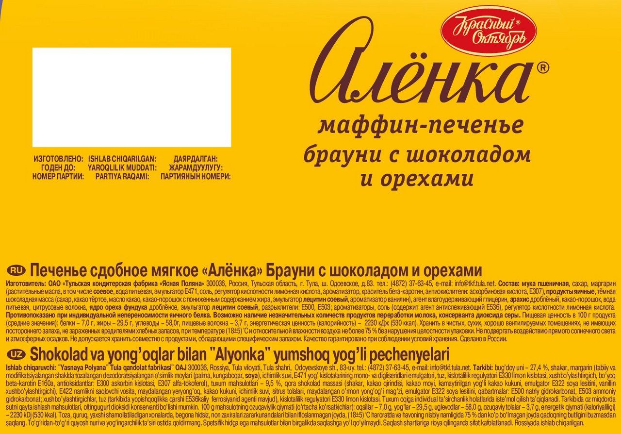Маффин-печенье Аленка брауни с орехами - это вкусное и питательное лакомство для детей и взрослых. Каждая упаковка содержит 138г аппетитного десерта, который станет отличным дополнением к полднику или утреннему чаю. Этот продукт идеально сочетает в себе нежную текстуру маффина и насыщенный вкус брауни, что обеспечивает неповторимое наслаждение с каждым укусом. В состав печенья входят отборные орехи, которые добавляют не только хрустящую текстуру, но и полезные микроэлементы.