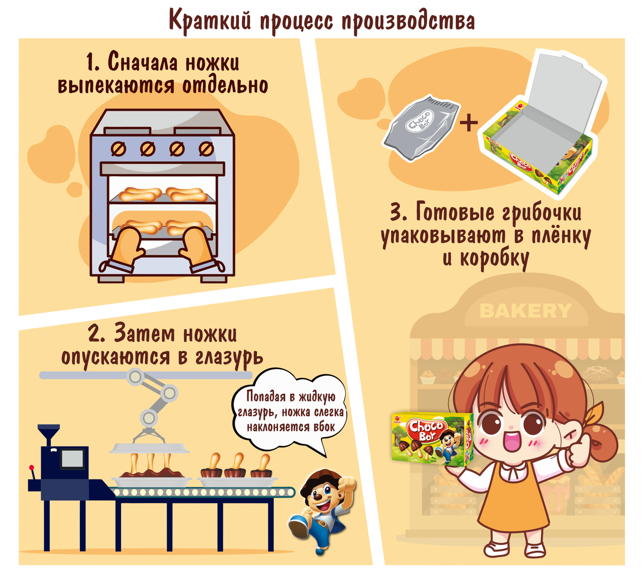 Сhoco Boy — печенье в форме грибочка со шляпкой из молочной глазури и хрустящей бисквитной ножкой. Яркий вкус и веселый вид делают Сhoco Boy самым желанным лакомством для детей и дарят настроение праздника. Используйте это печенье для декора домашних десертов: грибочки отлично украсят любой торт к детскому празднику или песочные корзиночки со сливочным кремом.