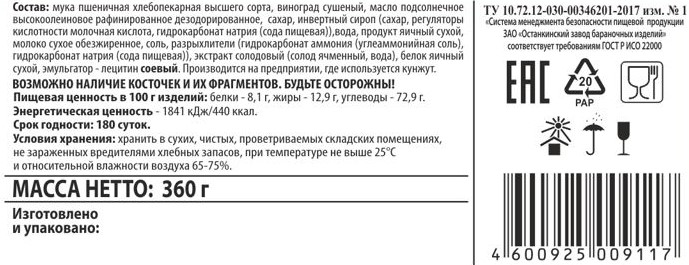 Мука пшеничная хлебопекарная высшего сорта, виноград сушёный, масло подсолнечное высокоолеиновое рафинированное дезодорированное, сахар, инвертный сироп сахар, регуляторы кислотности молочная кислота, гидрокарбонат натрия сода пищевая, вода, продукт яичный сухой, молоко сухое обезжиренное, соль, разрыхлители гидрокарбонат аммония углеаммонийная соль, гидрокарбонат натрия сода пищевая, экстракт солодовый солод ячменный, вода, ароматизатор Ваниль-мёд, белок яичный сухой, эмульгатор - лецитин соевый.
