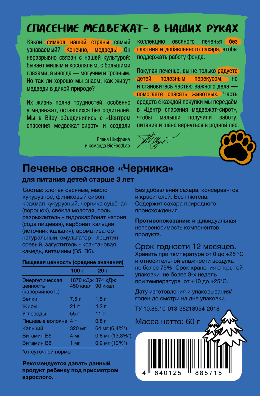 Овсяное печенье без глютена Bitey с черникой - 100% натуральный снек без добавления сахара, искусственных красителей, ароматизаторов и консервантов. Уникальная овсяная рецептура имеет официальный сертификат Без глютена, поэтому печенье подходит даже детям с целиакией. В составе - овсяные хлопья, финиковый сироп, фрукты и ягоды. Дополнительно мы обогащаем печенье кальцием и витаминами B5 и B6 - для гармоничного роста и развития ребёнка. Печенье идеально подходит для школы: не содержат арахис, орехи, лактозу и глютен - а значит, ими можно делиться с друзьями без риска аллергии. Вдохновлённая заботой о дикой природе, коллекция с медвежатами создана в партнёрстве с АНО Центр спасения медвежат-сирот в Тверской области. Покупая продукты из этой коллекции, вы помогаете спасать медвежат-сирот, оставшихся в дикой природе. Bitey перечисляет часть средств с продажи снеков в адрес Центра. Внутри упаковки - яркая коллекционная карточка с реальной историей спасения одного из медвежат-сирот.