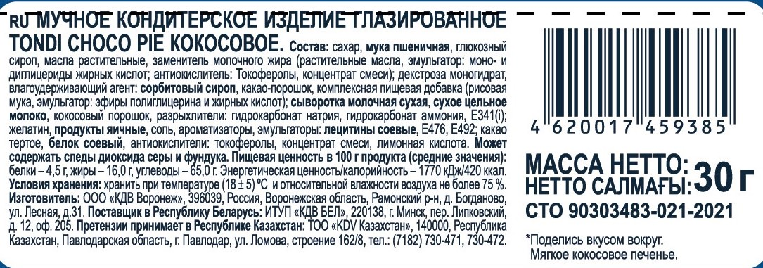 Сахар, мука пшеничная, глюкозный сироп, масла растительные, заменитель молочного жира (растительные масла, эмульгатор: моно- и диглицериды жирных кислот; антиокислитель: Токоферолы, концентрат смеси); декстроза моногидрат, влагоудерживающий агент: сорбитовый сироп, какао-порошок, комплексная пищевая добавка (рисовая мука, эмульгатор: эфиры полиглицерина и жирных кислот); сыворотка молочная сухая, сухое цельное молоко, кокосовый порошок, разрыхлители: гидрокарбонат натрия, гидрокарбонат аммония, Е341(i); желатин, продукты яичные, соль, ароматизаторы, эмульгаторы: лецитины соевые, Е476; какао тертое, белок соевый. Может содержать следы диоксида серы и фундука.