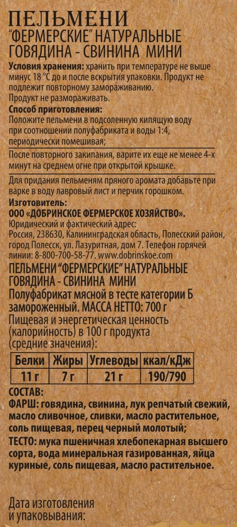Приготовлены по строгим стандартам качества на современном оборудовании. Такое блюдо станет отличной альтернативой домашней еде и поможет сэкономить время. Порадуют сбалансированным вкусом, сочностью, лёгким пряным послевкусием. Тесто тонкое и эластичное, не рвётся при варке. Сочность рубленому фаршу придаёт измельчённый репчатый лук. Среди ингредиентов нет загустителей, консервантов и других добавок. Это полностью натуральный продукт, приготовленный по традиционной рецептуре. Пельмени рекомендуем подавать со сметаной или сливочным маслом, заправить горчицей или хреном. Сваренные пельмени можно поджарить и подать с соевым соусом. Оттенит вкус мяса изысканная орехово-сметанная заправка.