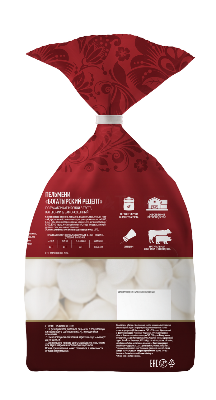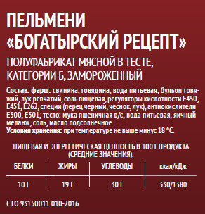 Пельмени Богатырские – то, что нужно для ароматного и сытного обеда. Внутри тонкого теста сочная начинка из отборной свинины, с добавлением душистых специй и наваристого говяжьего бульона. Наш бульон мы варим сами в течение 6 часов из натуральных ингредиентов. Поэтому наши пельмени такие сочные, мясные и полезные. Приятного аппетита!