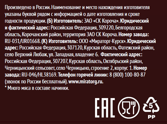 Фарш: свинина, вода питьевая, бульон говяжий, лук репчатый, соль пищевая, регуляторы кислотности E450, E451, E262 ii, специи (перец, чеснок, лук), антиокислители Е300, Е301, агент антислеживающий Е551; тесто: мука пшеничная в/с, вода питьевая, яичный меланж, соль, масло подсолнечное.