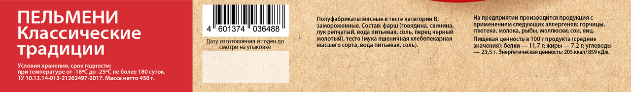 Пельмени изготовлены из мягкого, тонкого, эластичного теста, которое не рвется во время приготовления, с сочной начинкой из охлажденной говядины и свинины, с добавлением натурального репчатого лука. К готовому фаршу добавляем только немного соли и черного молотого перца. В составе теста только мука пшеничная хлебопекарная высшего сорта и питьевая вода, без улучшителей и консервантов. Мясной начинки больше, чем теста: процент вложения начинки - 55%, тестовая оболочка - 45%.