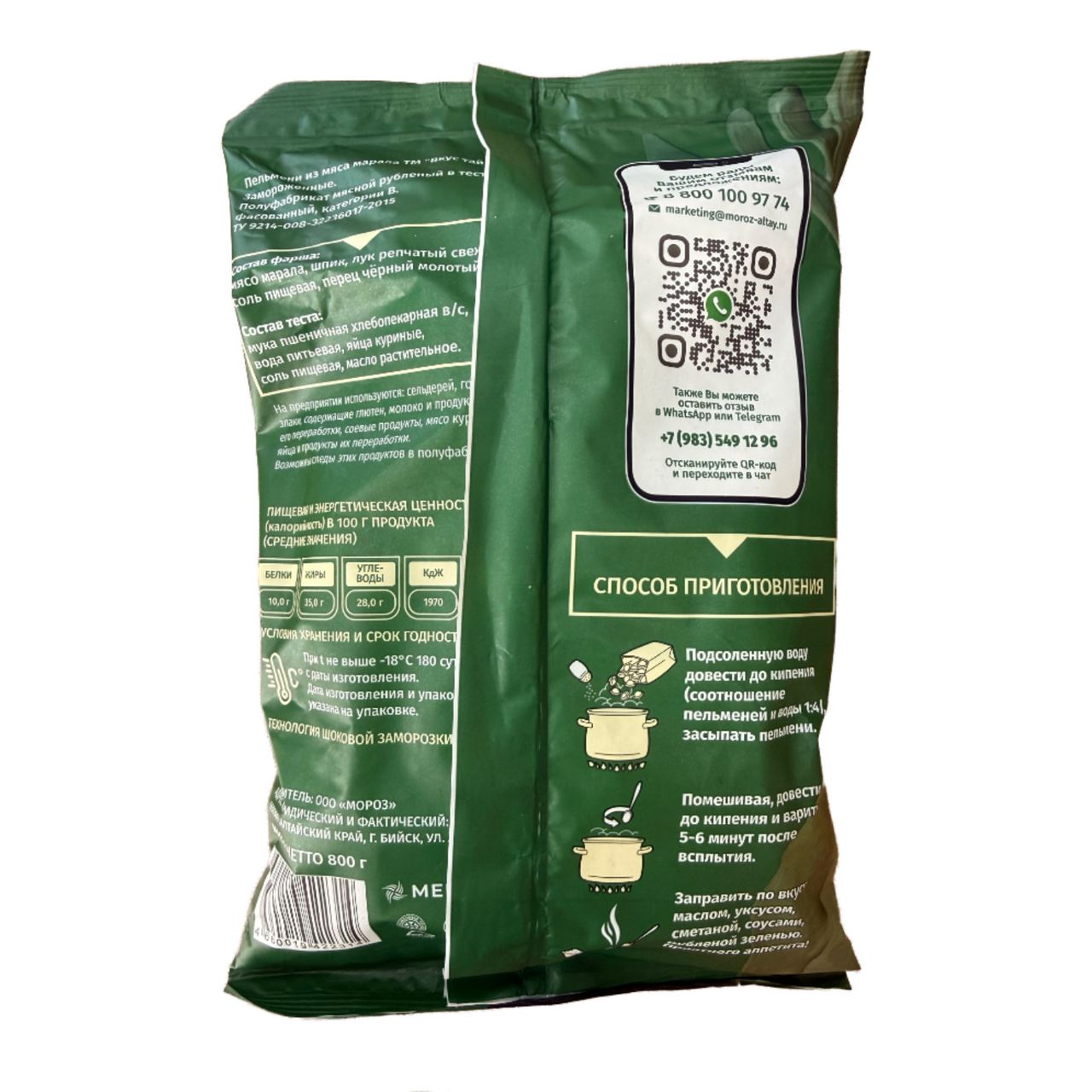 Ценители знают, что мясо Марала отличает тонкий, особенный аромат и вкус дикого мяса. Продукт станет отличным поводом познакомиться со вкусом настоящего дикого мяса. Пельмени приготовлены только из натуральных ингредиентов. В традиционное пшеничное тесто завернута сытная начинка. Мясо марала имеет специфический вкус, который не перебивается яркими специями. Чтобы начинка была более сочной, в нее добавили свиной шпик и репчатый лук. А приятную пикантность ей обеспечивает черный перец.