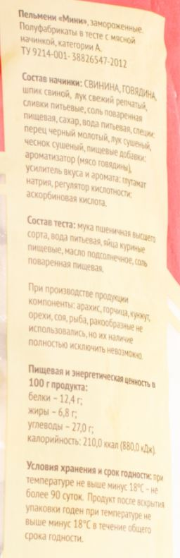 Свинина, говядина, шпик свиной, лук свежий репчатый, сливки питьевые, соль поваренная пищевая, сахар, вода питьевая, специи: перец черный молотый, лук сушеный, чеснок сушеный, пищевые добавки: ароматизатор мясо говядины, усилитель вкуса и аромата: глутамат натрия, регулятор кислотности: аскорбиновая кислота; тесто: мука пшеничная высшего сорта, вода питьевая, яйца куриные пищевые, масло подсолнечное, соль поваренная пищевая.