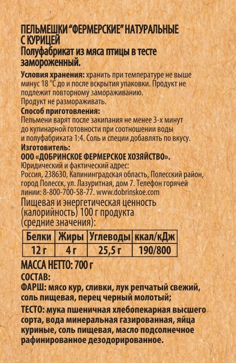 Пельмешки Добринское Фх Фермерские натуральные с курицей замороженные, 700г