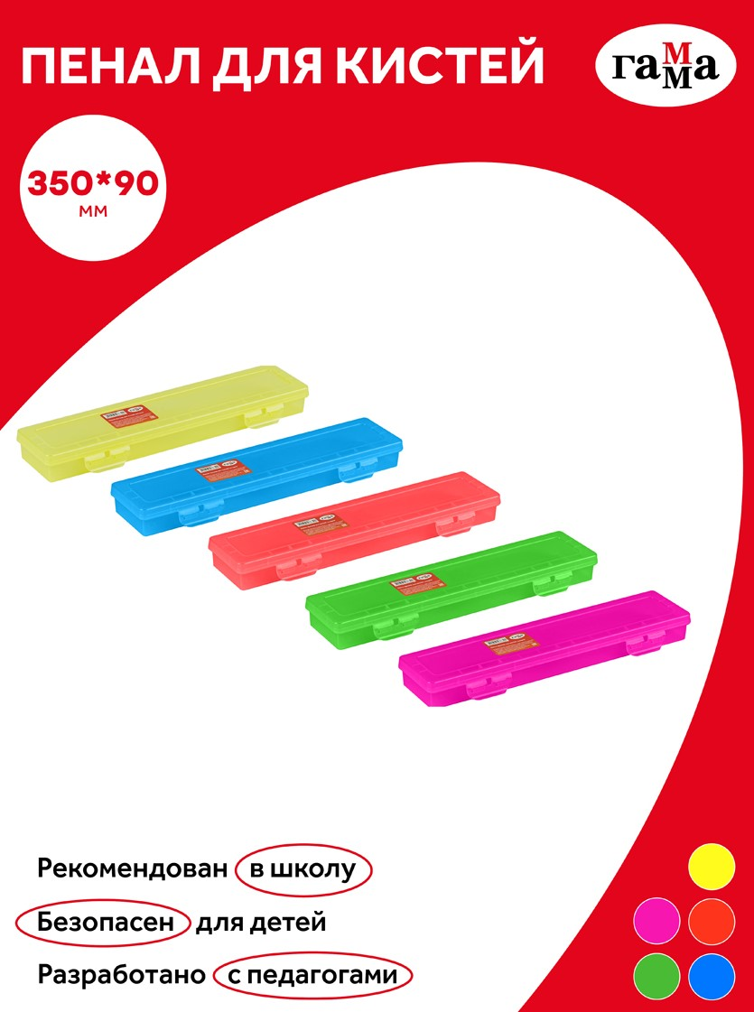 Пенал-футляр Гамма предназначен для хранения и переноски кистей, карандашей и других инструментов для творчества. Представлено ассорти из 6 неоновых цветов: зелёный, жёлтый, голубой, розовый, пурпурный, фиолетовый.