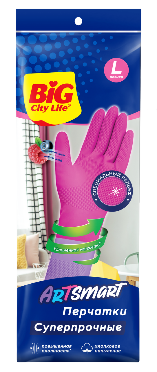 Перчатки хозяйственные Big City ArtSmart латексные суперпрочные удлиненные с хлопковым напылением и ароматом лесных ягод, р.L