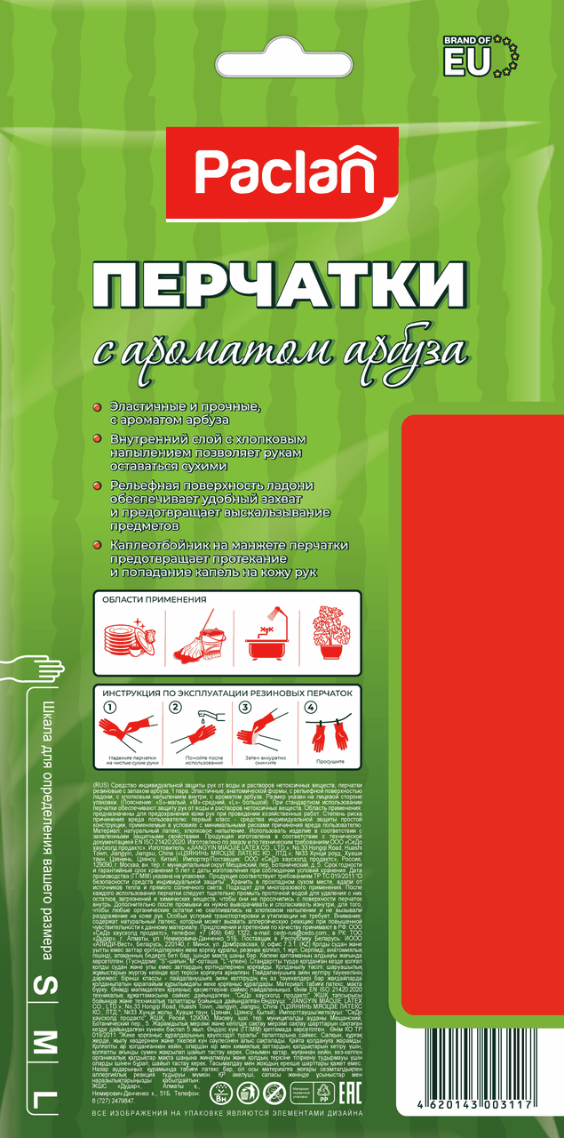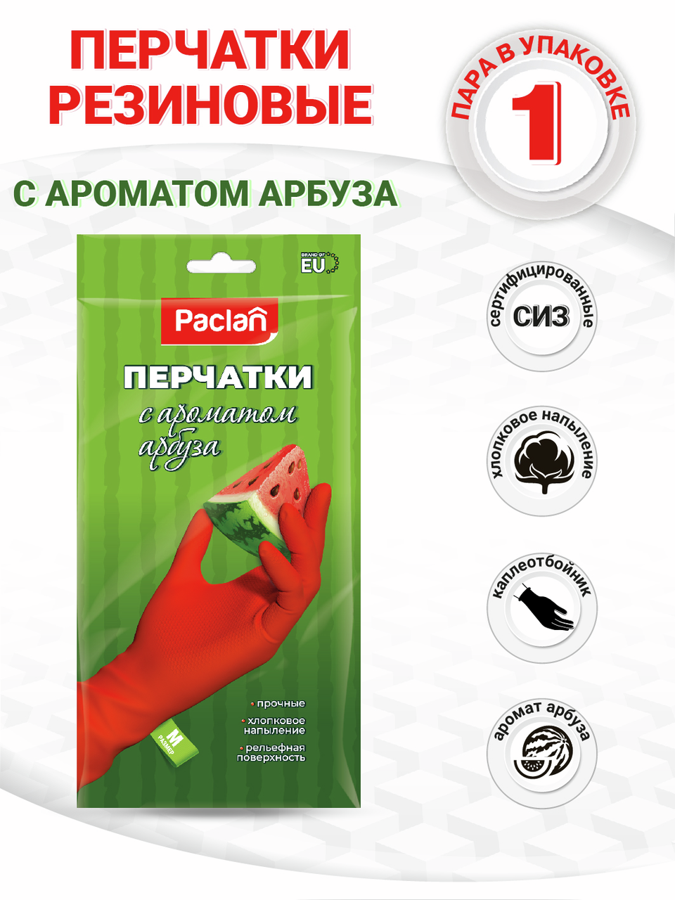Перчатки Paclan с ароматом арбуза прекрасно подходят для защиты рук при выполнении хозяйственных работ по дому. Лёгкие и прочные, 100% хлопковое напыление. С ароматом арбуза, Яркий цвет перчаток. Сертифицированные. Рельефная поверхность ладони обеспечивает удобный захват и предотвращает выскальзывание предметов. Специальный каплеотбойник на манжете перчатки предотвращает протекание и попадание капель на кожу рук. Перчатки изготовлены из высокопрочного сырья, выдерживающего многократное использование. При повреждениях (проколы, порезы перчатки отверстия не расползаются. Предназначены для защиты рук при выполнении хозяйственных работ по дому. Рельефная поверхность ладони обеспечивает удобный захват и предотвращает выскальзывание предметов.
