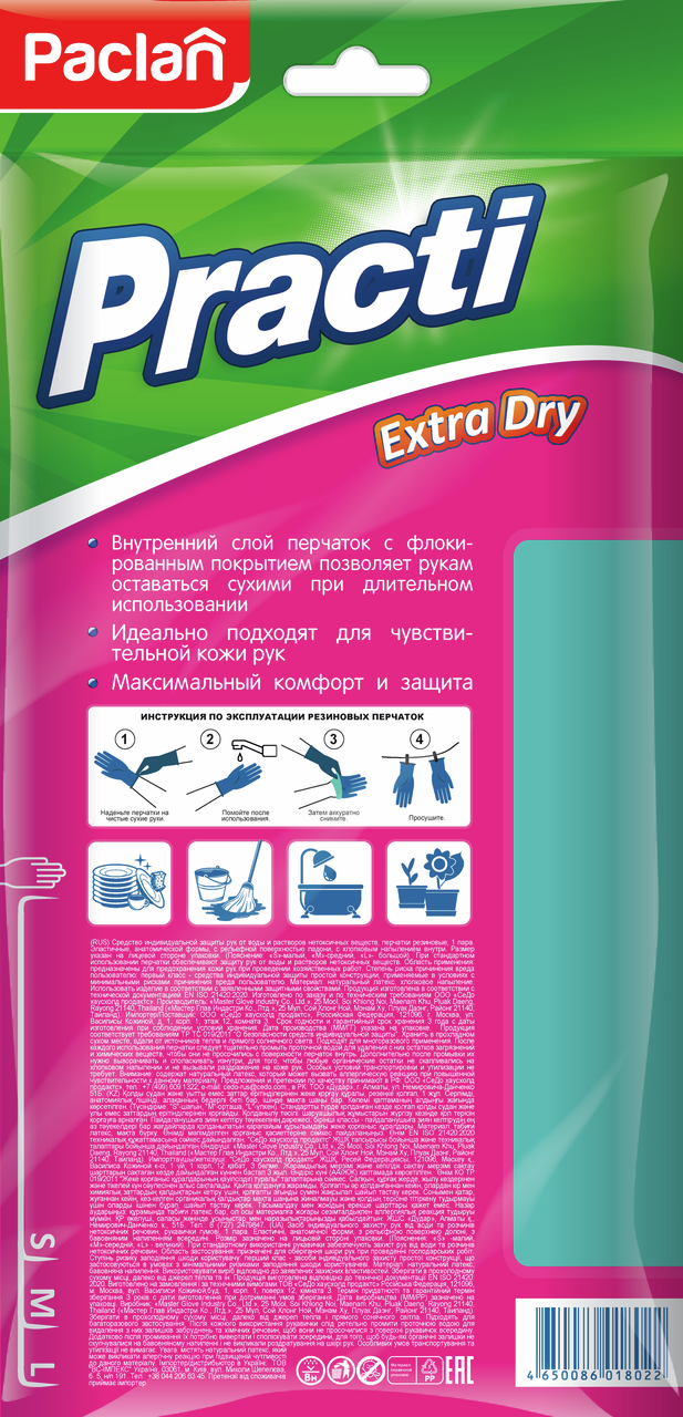 Перчатки Paclan Extra Dry, размер L обеспечивают максимальную защиту рук во время хозяйственных работ по дому. При уборке они защищают руки от химических веществ, грязи и пыли, а также уменьшают риск порезов и ожогов. Перчатки также удобны для мытья посуды, стирки белья и других бытовых дел. Инновационная технология флокирования обработки внутренней поверхности перчаток совершенствует свойства хлопкового напыления. Изделия имеют невероятно мягкий и бархатистый внутренний слой. В перчатках руки остаются сухими даже при длительном использовании. Они подходят для чувствительной кожи рук. Обеспечивают максимально комфортную защиту рук и маникюра.
