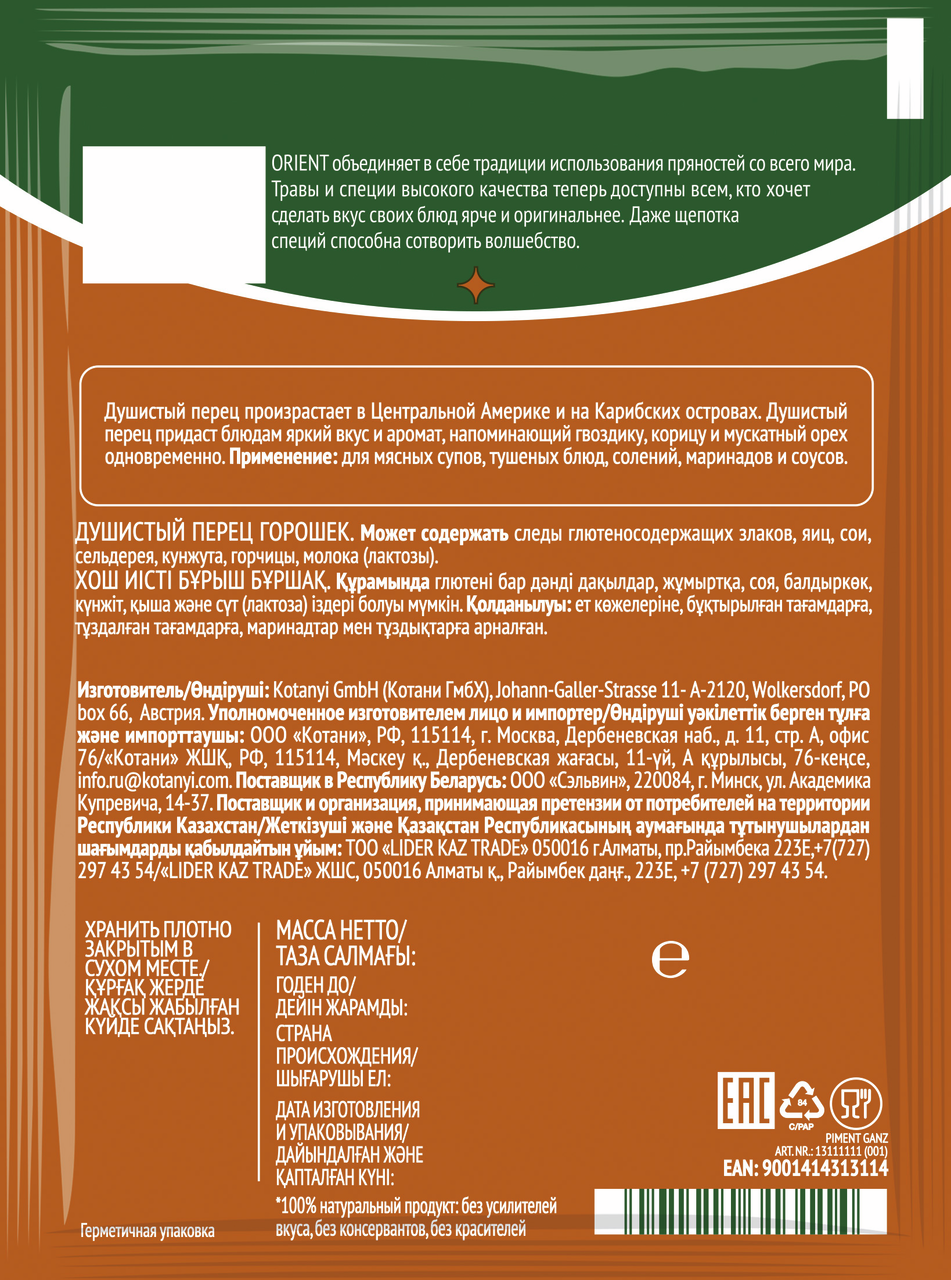 Перец душистый горошек Orient, 10г используется в кулинарии во время приготовления маринадов, соусов и консервов из мяса, рыбы, овощей, а также супов и бульонов. Данную приправу помещают в блюдо в самом начале готовки, так как горошек не имеет той остроты и пряности, как у молотого перца. Представленная специя оказывает на организм ряд положительных свойств: повышает аппетит и нормализует пищеварение, стимулирует выработку желудочного сока, ускоряет метаболизм и способствует быстрому похудению, улучшает состояние кожи, волос и ногтей. Душистый перец не требует особых условий хранения — достаточно держать его в герметичной емкости.