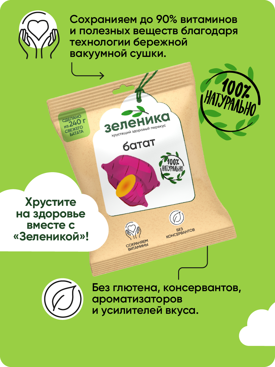 Здоровый овощной перекус от Зеленика — это кусочки хрустящего батата, представляющего собой настоящий кладезь витаминов и микроэлементов. Продукт позволит насытить организм энергией, не принеся ни капли вреда. Ломтики овоща обработаны по новейшей щадящей технологии, позволяющей полностью сохранить все свойства и качества продукта, упакованы в брендированный пакетик весом 30 г. Для большей аппетитности кусочки батата немного сдобрены солью и приправлены капелькой подсолнечного масла.