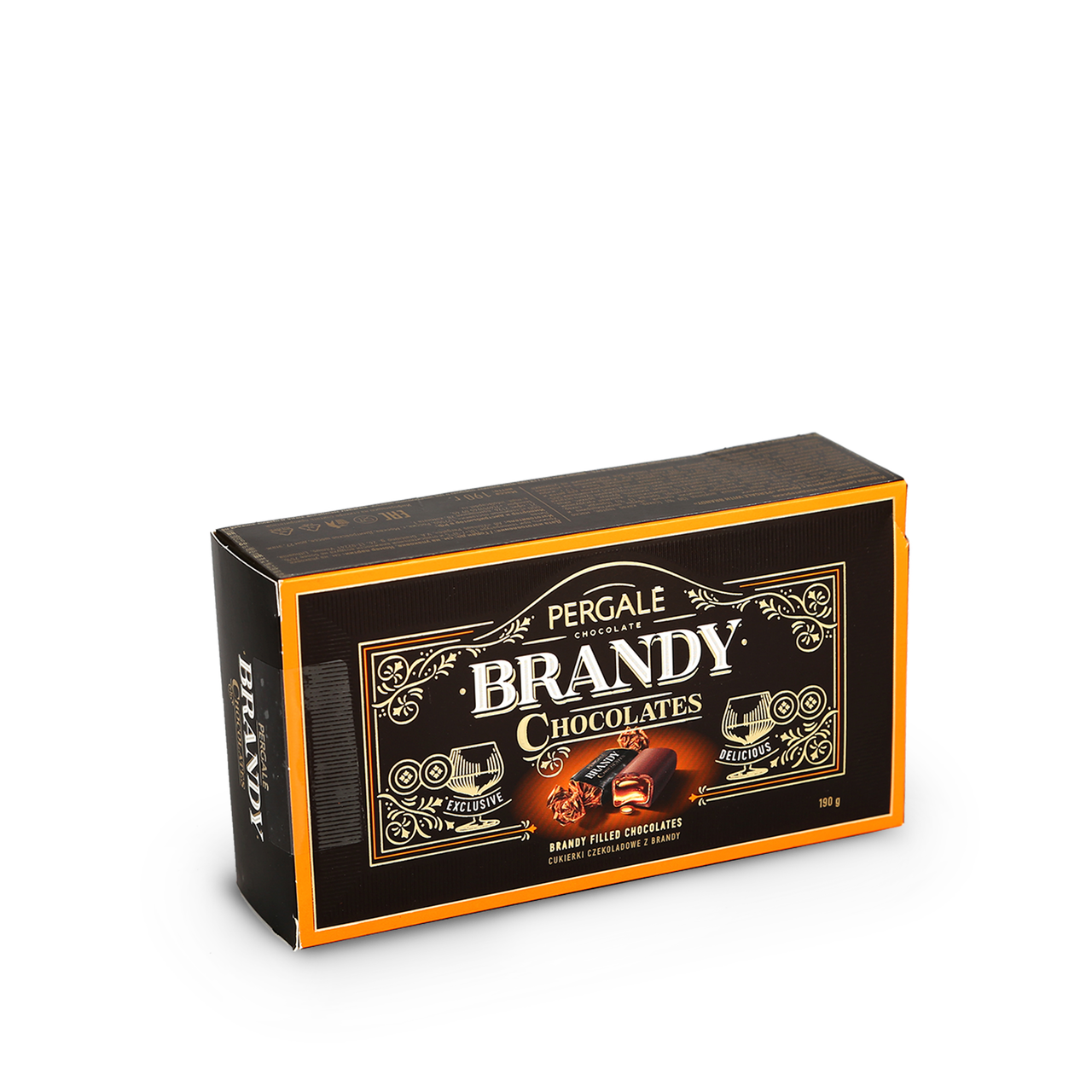 Cостав короба: 12шт. Состав: сироп сахарный (сахар, вода), темный шоколад (30%) (сахар, какао тертое, масло пальмовое, масло ши, масло какао, эмульгаторы (лецитин соевый, эфиры полиглицерина и взаимоэтерифицированных рициноловых кислот), ароматизатор), бренди (3%) (бренди, сахар, краситель (сахарный колер I простой)), спирт этиловый (3%), ароматизатор, крахмал кукурузный. В продукте содержится соя и ее продукты. Может содержать кешью, миндаль, фундук, арахис, яйца, молоко и их продукты (включая лактозу). В конфетах содержится 70 % жидкой начинки. Продукт содержит спирт этиловый – не предназначен для детей и беременных женщин. Условия хранения: при температуре от 15C до 21C и при относительной влажности воздуха 75% Срок годности: 12 месяцев