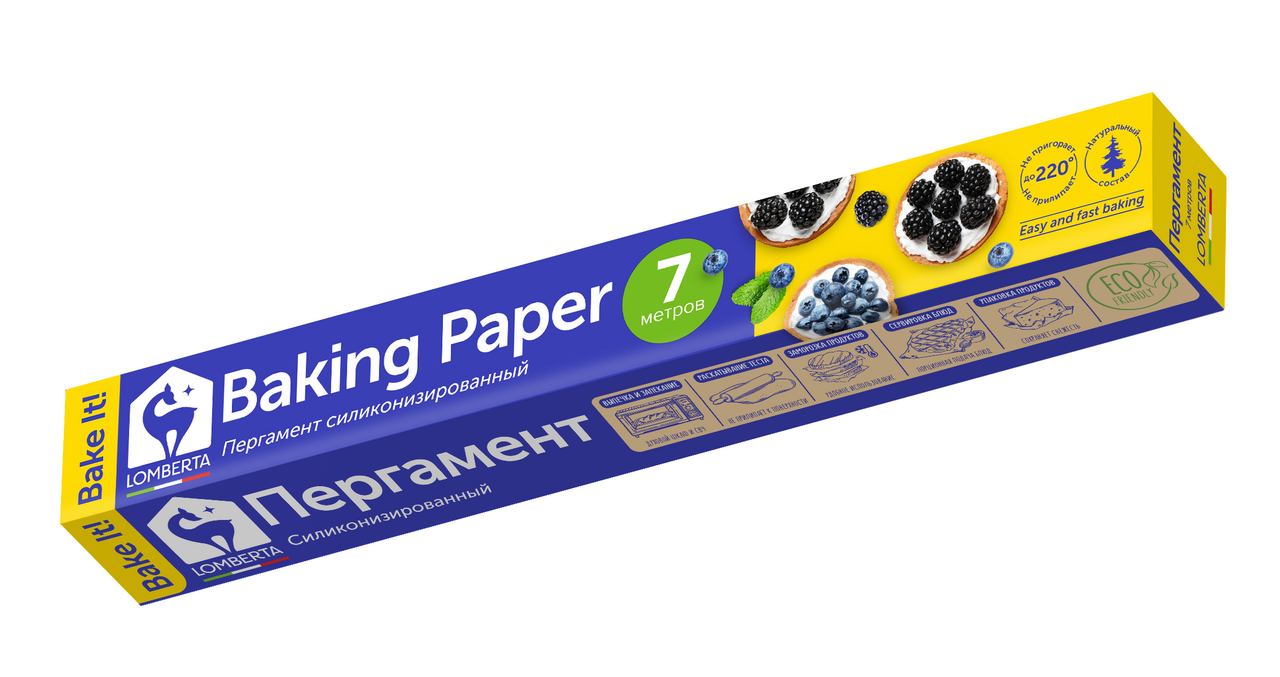 Пергамент Lomberta для выпечки, 7 м предназначен для выпечки в духовках электрических и газовых плит, СВЧ-печей. Изделие имеет качественное двустороннее силиконовое покрытие и не нуждается в смазке. Оно исключает прилипание и пригорание пищи. Бумага для выпечки Lomberta выдерживает высокие температуры до 220 С, не пропускает жир и воду. Более того пергамент можно использоваться повторно – после приготовления выпечки он не теряет своих первоначальных характеристик. Это отличный вариант для духовых шкафов и микроволновых печей, для домашнего использования, а также для кафе и ресторанов. Пергамент не занимает много места при хранении. Он поставляется в компактном рулоне, поэтому его удобно держать в ящике стола.