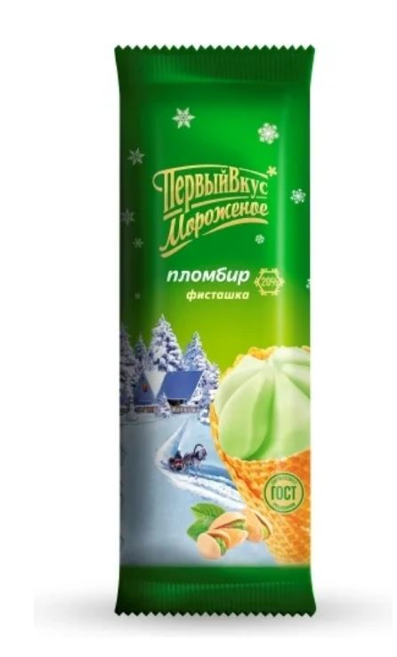 Мороженое Первый вкус рожок пломбир фисташка, 80г БЗМЖ — натуральный пломбир, созданный по классической рецептуре согласно ГОСТу. Сочная и нежная консистенция буквально тает во рту, оставляя насыщенное фисташковое послевкусие. Десерт заключен в аппетитный вафельный рожок с шоколадной глазурью, который вкусно похрустывает при откусывании. Лакомство в меру сладкое, не приторное и отлично освежает жарким летним днем. Его производят из натурального молока и сливочного масла: все составляющие рецептуры проходят строгий контроль качества. За счет этого пломбир приобретает привлекательный вкус и мягкую текстуру, которая так нравится взрослым и детям. Мороженое приятно съесть дома за просмотром интересного фильма или во время прогулки в компании друзей. Благодаря высокой энергетической ценности оно питательное, легко усваивается и быстро утоляет голод. Угощение не только вкусное, но и полезное, ведь оно богато кальцием, магнием, витаминами А, Е, D. Десерт повышает настроение, придает сил, заряд бодрости и положительных эмоций. Лакомство можно дегустировать как в чистом виде, так и подать его к какао или крепкому кофейному напитку. Десерт хорошо сочетается с фруктовым сиропом, конфитюром, джемом, печеньем, дробленным фундуком и миндальными лепестками. Порцию мороженого уместно предложить к теплому яблочному штруделю, жаренным бананам и ароматным домашним вафлям. Продукт оформлен в плотную упаковку флоу-пак, которая без усилий раскрывается руками. Обертка на протяжении всего срока годности сохраняет свежесть пломбира и предотвращает проникновение неприятных запахов. Яркий и красочный дизайн с фирменным логотипом сразу бросается в глаза и привлекает внимание к товару. Пломбир изготавливается АО Группа Компаний Российское Молоко, которое объединяет в себе 5 крупных предприятий. Основные постулаты производителя — натуральные составляющие, соответствие ГОСТу и постоянно расширяющаяся линейка продукции. Ассортимент создается на современном оборудовании по традиционным рецептам с различными наполнителями, среди которых каждый найдет свой любимый вкус.
