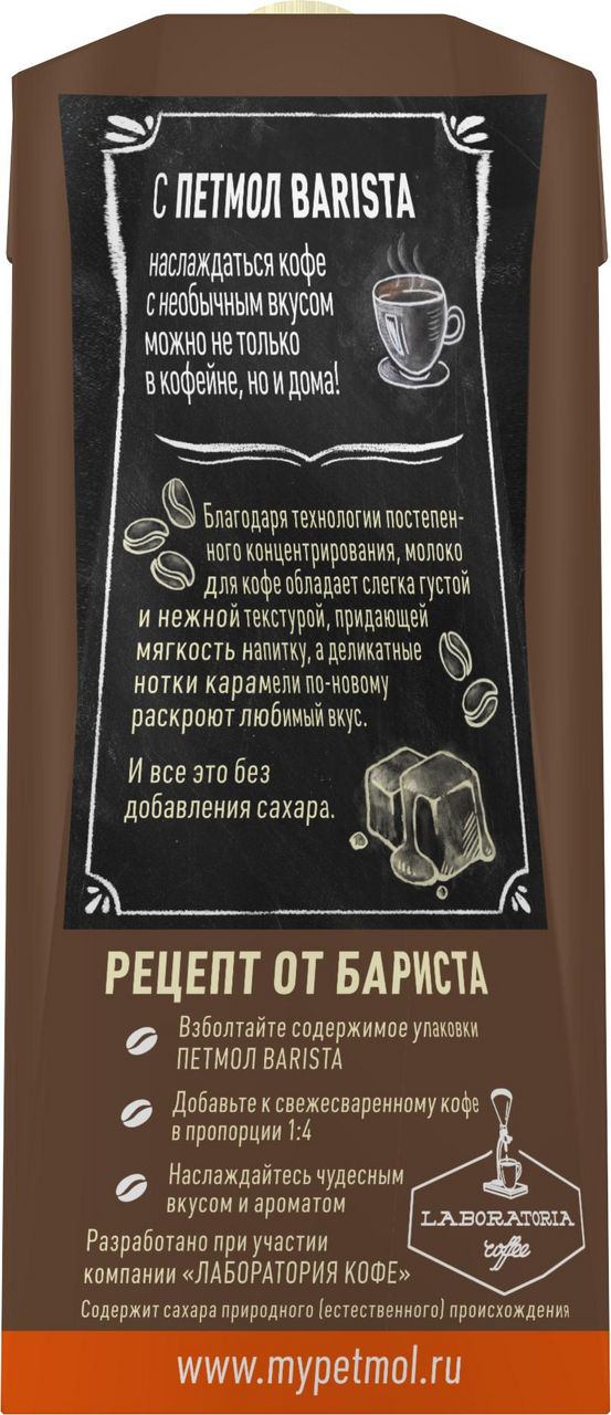 Наслаждаться кофе с необычным вкусом можно не только в кофейне, но и дома, благодаря концентрированному молоку для кофе "Петмол Barista" со вкусом карамели.Благодаря технологии постепенного концентрирования, молоко для кофе обладает слегка густой и нежной текстурой, придающей мягкость напитку, а деликатные нотки карамели по-новому раскроют любимый вкус. И все это без добавленного сахара!