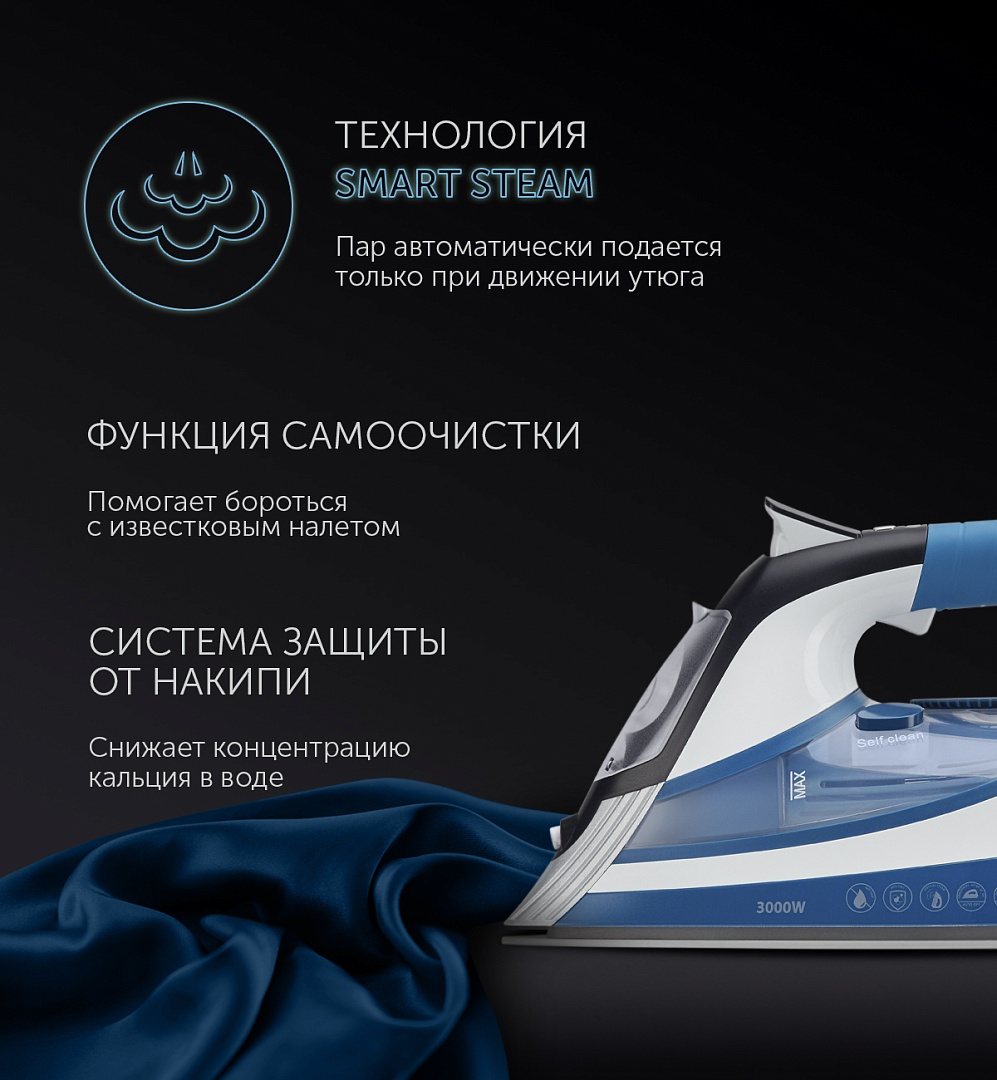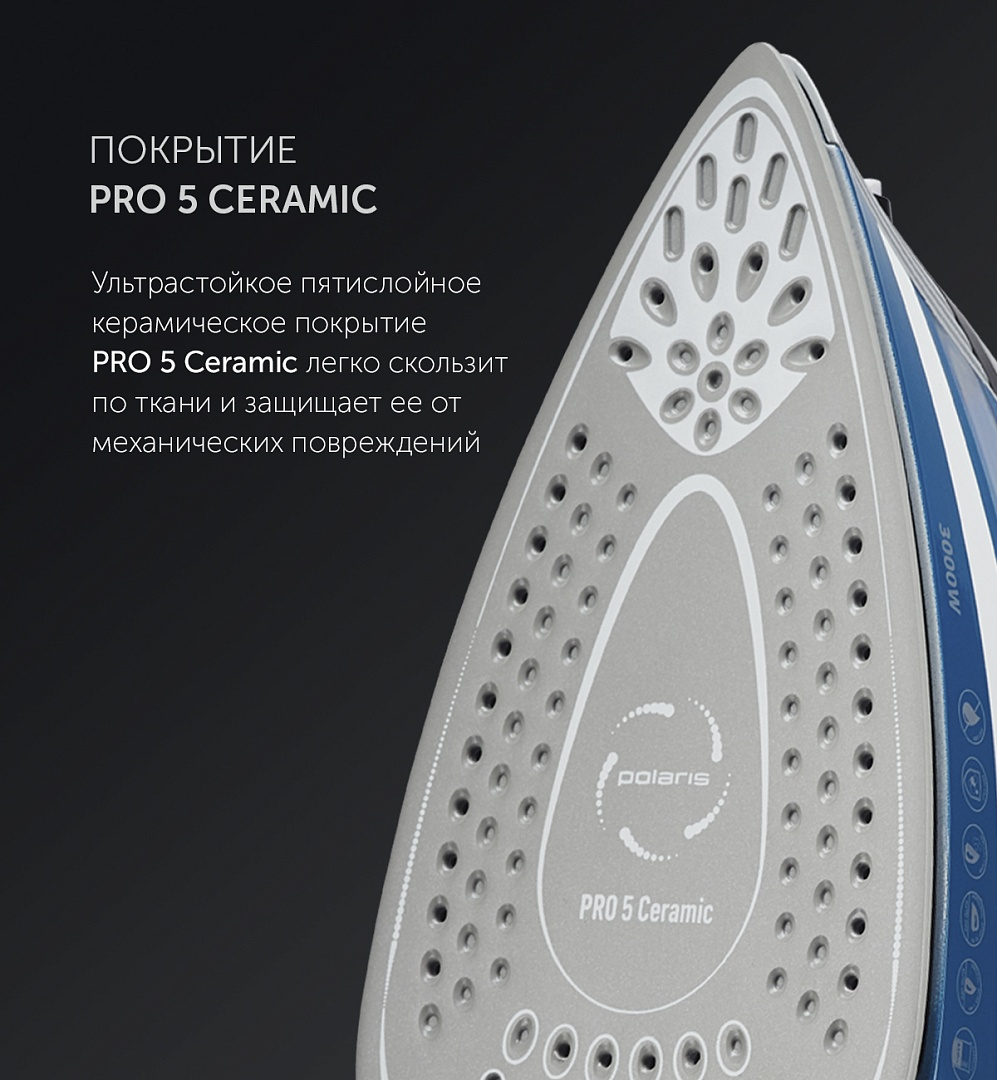 Керамическое покрытие подошвы PRO 5 CERAMIC.Встроенный парогенератор.Уникальный датчик движения SMART STEAM - пар автоматически подается только при движении утюга.Система автоматического отключения.Антикапельная система.Система предотвращения образования накипи.Функция самоочистки.Плавная регулировка температуры.Индикатор нагрева утюга.Эргономичная прорезиненная ручка.Устройство распыления воды.Режимы работы:- сухое глажение;- постоянная подача пара (75 г/мин);- паровой удар 260 г/мин;- вертикальное отпаривание.Шарнирное вращение шнура на 360 ?.Удобное расширенное заливное отверстие.Резервуар для воды - 450 мл.Мерный стакан для воды.