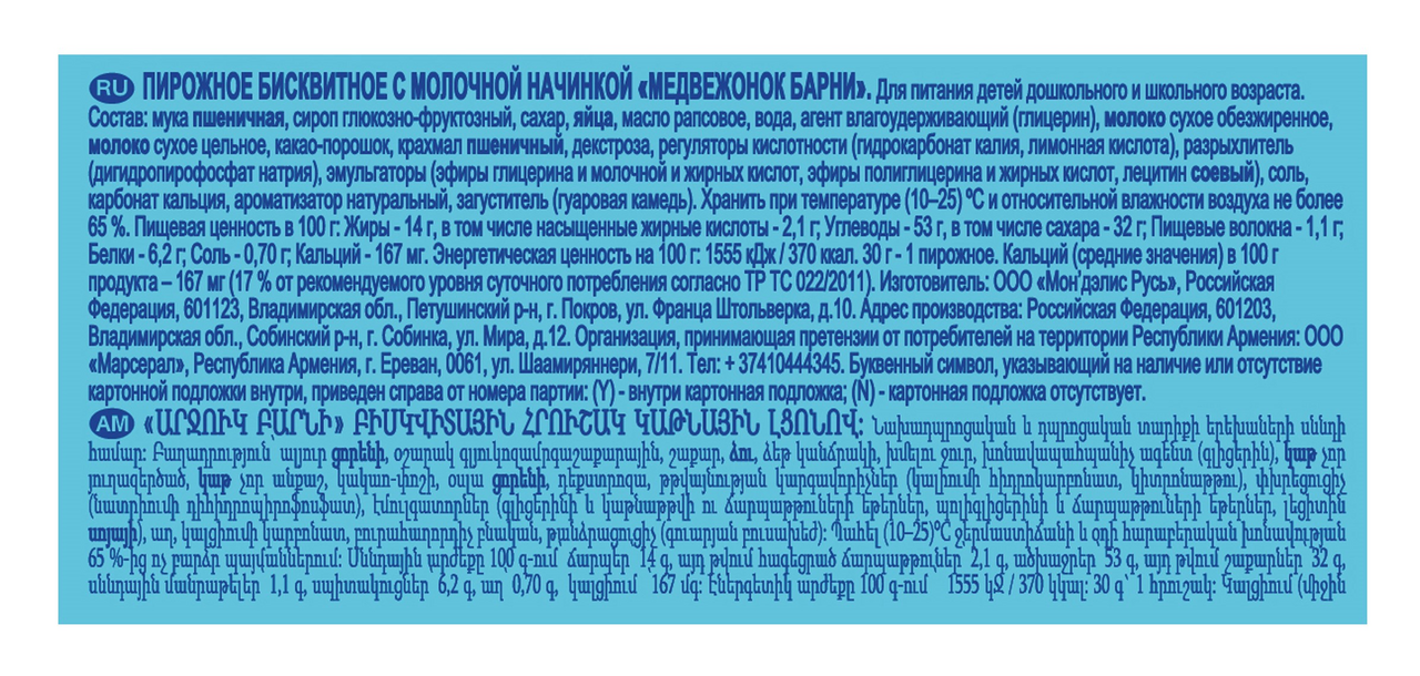 Участвует в конкурсе: Выиграйте кофемашину на сладкое! Совершите покупку товаров-участников на сумму от 1500₽ с 23 октября 2025г. по 14 января 2026г. и получите шанс выиграть кофемашину или другие сладкие призы! Чем больше покупок - тем больше шансов на победу! Подробнее об акции - https://cdn.metro-cc.ru/ru/mndlz_2025.pdf. Специально разработанное для детей кондитерское изделие в виде медвежонка, производится на основе натуральных ингредиентов: злаков и молочных продуктов. Обогащено кальцием, необходимым для здорового роста и развития детей, не содержит красителей и консервантов. Рекомендовано для детей дошкольного возраста от 3х лет. Медвежонок Барни - вкусный, полезный и питательный перекус, прекрасная альтернатива печенью, кексам или другой сладкой выпечке, отлично сочетается с соком, молоком, кефиром, йогуртом, чаем или какао. Благодаря индивидуальной упаковке, его удобно брать с собой в дорогу, давать ребенку в школу или на прогулку. Это отличный вариант сладкого угощения на детский праздник в детский сад, школу, на День рождения. Мишка Барни - это выбор мам, 83% мам купили бы этот вкусный десерт для своего ребенка.