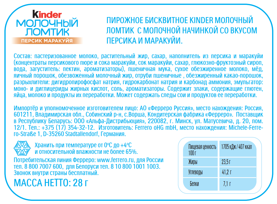 Kinder Молочный Ломтик Персик-Маракуйя - это вкусное дополнение к любому завтраку. Продукт содержит натуральное молоко, каплю мёда и нежный бисквит, который так любят дети. Как и все молочные продукты, хранить Kinder Молочный Ломтик Персик-Маракуйя нужно только в холодильнике.