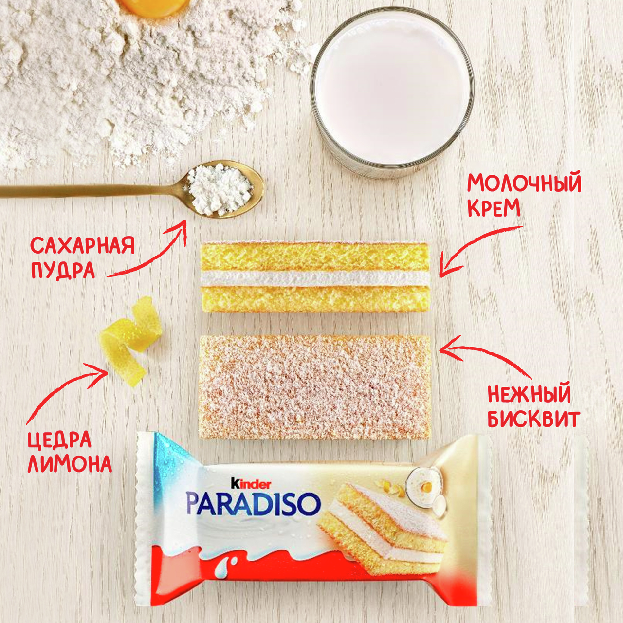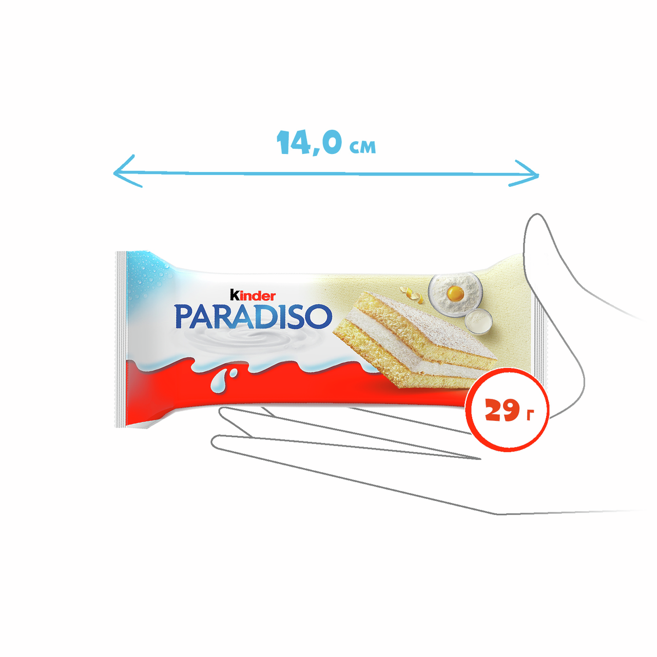 Пирожное Kinder Paradiso бисквитное 23.3%, 29г — вкусный светлый бисквит с нежной молочной начинкой и вкусном лимона, посыпанный сахарной пудрой. Как и все молочные продукты его нужно хранить в холодильнике. Продукт не содержит красителей и консервантов.