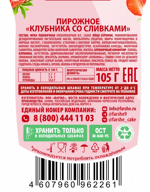 Мука пшеничная хлебопекарная высшего сорта, сахар, яйцо куриное, рафинированное дезодорированное растительное масло, эмульгаторы (лецитин, эфиры полиглицерина и жирных кислот), стабилизаторы (стеароил-2-лактилат натрия, карбоксиметилцеллюлоза), молоко обезжиренное, загуститель (мальтодекстрин, ксантановая камедь), молочная сыворотка, концентрат белка молочной сыворотки, лактоза, клубничный конфитюр (патока, клубника, загуститель (дикрахмалфосфат оксипропилированный), регулятор кислотности (лимонная кислота), краситель (кармин), ароматизатор клубника), сливки сухие из цельного молока, консервант (сорбат калия), кукурузный крахмал, краситель (понсо 4r).