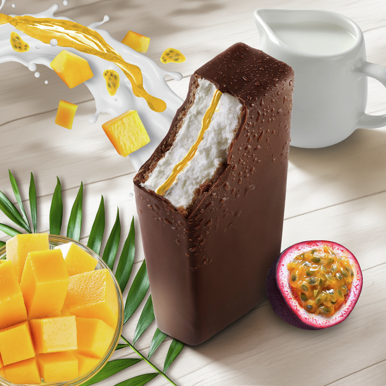 Начинка из манго и маракуйи (пюре из манго, пюре из маракуйи, сахар, глюкозно-фруктозный сироп, стабилизатор: амидированный пектин, регуляторы кислотности: цитрат натрия, лимонная кислота, ароматизатор), шоколад (сахар, какао тёртое, масло какао, эмульгатор: лецитин, ароматизатор: ванилин), пастеризованное молоко, сахар, растительный жир, пшеничная мука, сухое обезжиренное молоко, обезвоженный молочный жир, декстроза, яичный порошок, обезжиренный какао порошок, дрожжи хлебопекарные, эмульгатор: моно- и диглицериды жирных кислот, ароматизатор, соль, сухой экстракт ячменного солода.