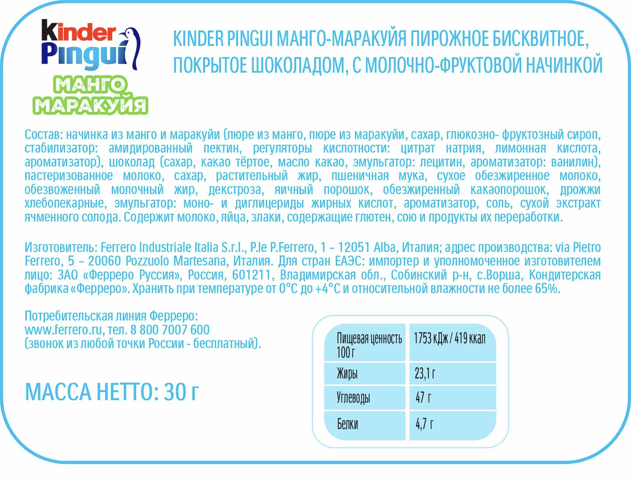 Пирожное бисквитное глазированное Kinder Pingui с манго и маракуйей, 30г