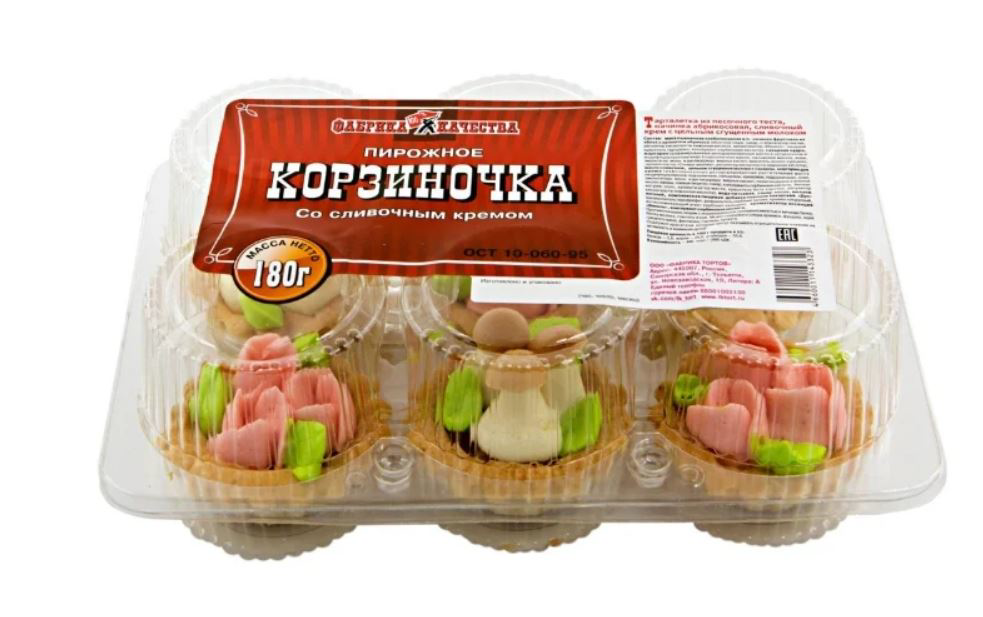 Пирожное Фабрика качества Корзиночка со сливочным кремом, 180г изготавливается из песочного теста и заполнено абрикосовой начинкой и сливочным кремом с цельным сгущенным молоком. Маленькое произведение искусства для самого приятного чаепития в кругу близких.