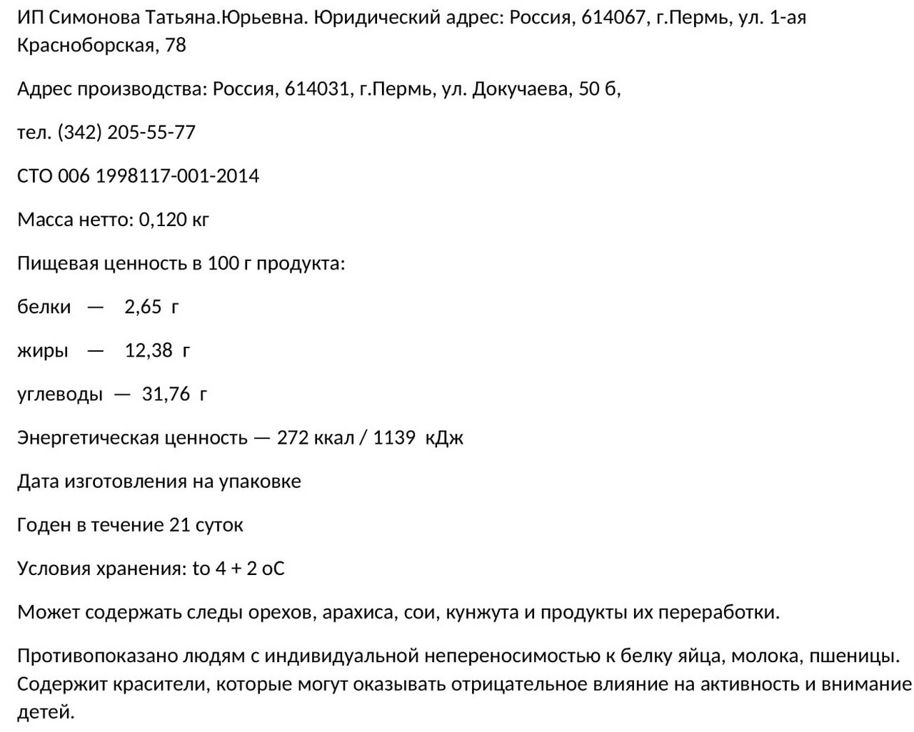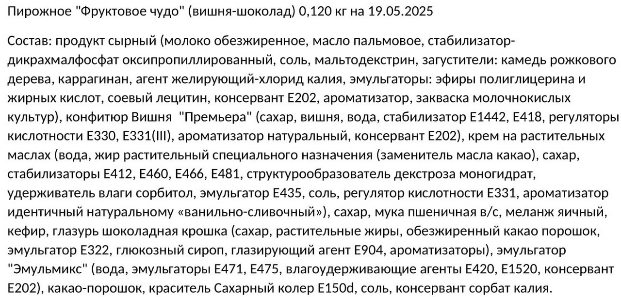 Продукт сырный (молоко обезжиренное, масло пальмовое, стабилизатор-дикрахмалфосфат оксипропилированнный, соль, мальтодекстрин, загуститель: камедь рожкового дерева, каррагинан, агент желирующий-хлорид калия, эмульгаторы: эфиры полиглицерина и жирных кислот, соевый лецитин, консервант Е202, ароматизатор, закваска молочнокислых культур), конфитюр Вишня "Премьера" (сахар, вишня, вода, стабилизатор E1442, E418, регуляторы кислотности E330, E331(III), ароматизатор натуральный, консервант Е202), крем на растительных маслах (вода, жир растительный специального назначения (заменитель масла какао), сахар, стабилизаторы E412, E460, E466, E481, структурообразователь декстроза моногидрат, удерживатель влаги сорбитол, эмульгатор Е435, соль, регулятор кислотности Е331, ароматизатор идентичный натуральному ванильно-сливочный), сахар, мука пшеничная в/с, меланж яичный, кефир, глазурь шоколадная крошка (сахар, растительные жиры, обезжиренный какао порошок, эмульгатор Е322, глюкозный сироп, глазирующий агент E904, ароматизаторы), эмульгатор "Эмульмикс" (вода, эмульгаторы Е471, Е475, влагоудерживающие агенты E420, E1520, консервант E202), какао-порошок, краситель сахарный колер E150d, соль, консервант сорбат калия.