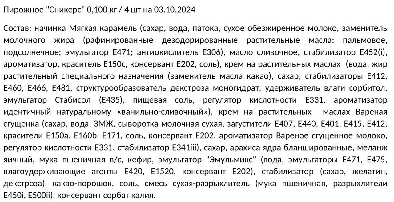 Начинка мягкая карамель (сахар, вода, патока, сухое обезжиренное молоко, заменитель молочного жира (рафинированные дезодорированные растительные масла: пальмовое, подсолнечное; эмульгатор Е471, антиокислитель ЕЗО6), масло сливочное, стабилизатор E452(i), ароматизатор, краситель Е150с, консервант Е202, соль), крем на растительных маслах (вода, жир растительный специального назначения (заменитель масла какао), сахар, стабилизаторы E412, E460, E466, E481, структурообразователь декстроза моногидрат, удерживатель влаги сорбитол, эмульгатор Стабисол (E435), пищевая соль, регулятор кислотности E331, ароматизатор идентичный натуральному ванильно-сливочный), крем на растительных маслах Вареная сгущенка (сахар, вода, ЗМЖ, сыворотка молочная сухая, загуститель E407, E440, E401, E415, E412, красители E150a, E160b, E171, соль, консервант Е202, ароматизатор Вареное сгущенное молоко, регулятор кислотности Е331, стабилизатор E341iii), сахар, арахиса ядра бланшированные, меланж яичный, мука пшеничная в/с, кефир, эмульгатор "Эмульмикс" (вода, эмульгаторы E471, E475, влагоудерживающие агенты Е420, E1520, консервант E202), стабилизатор (сахар, желатин, декстроза), какао-порошок, соль, смесь сухая-разрыхлитель (мука пшеничная, разрыхлитель E450i, E500ii), консервант сорбат калия.