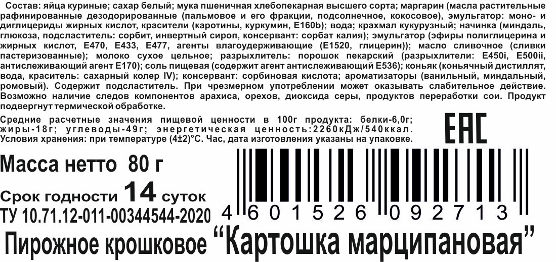 Яйца куриные, сахар белый, мука пшеничная хлебопекарная высшего сорта, маргарин масла растительные рафинированные дезодорированные пальмовое и его фракции, подсолнечное, кокосовое, эмульгатор: моно- и диглицериды жирных кислот, красители каротины, куркумин, Е160b, вода, крахмал кукурузный, начинка миндаль, глюкоза, подсластитель: сорбит, инвертный сироп, консервант: сорбат калия, эмульгатор эфиры полиглицерина и жирных кислот, Е470, Е433, Е477, агенты влагоудерживающий Е1520, глицерин, масло сливочное сливки пастеризованные, молоко сухое цельное, разрыхлитель: порошок пекарский разрыхлители: Е450i, E500ii, антислеживающий агент Е170, соль пищевая содержит агент антислеживающий Е536, коньяк коньячный дистиллят, вода, краситель: сахарный колер IV, консервант: сорбиновая кислота, ароматизаторы ванильный, миндальный, ромовый. Содержит подсластитель.