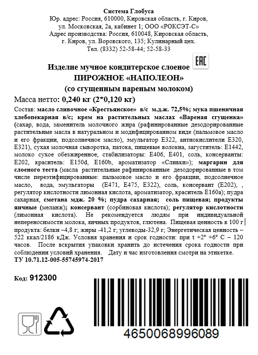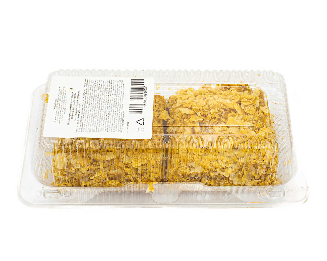 Масло сливочное Крестьянское в/с м.д.ж. 72,5%; мука пшеничная хлебопекарная в/с; крем на растительных маслах Вареная сгущенка (сахар, вода, заменитель молочного жира (рафинированные дезодорированные растительные масла в натуральном и модифицированном виде (пальмовое масло и его фракции, подсолнечное масло), эмульгатор Е322, антиокислители Е320, Е321), сухая молочная сыворотка, патока, пищевые волокна, загуститель: Е1442, молоко сухое обезжиренное, стабилизаторы: Е406, Е401, соль, консерванты: Е202, краситель: Е150d, Е160b, ароматизатор Сливки); маргарин для слоеного теста (масла растительные рафинированные дезодорированные в том числе переэтифицированные: пальмовое масло и его фракции, подсолнечное масло, вода, эмульгаторы (Е471, Е475, Е322), соль, консервант (Е202), , регулятор кислотности лимонная кислота, ароматизатор, краситель Е160а); пудра сахарная, сметана м.д.ж. 20 %; пудра сахарная; соль пищевая; продукты яичные (меланж); консервант (сорбиновая кислота); регулятор кислотности (лимонная кислота).