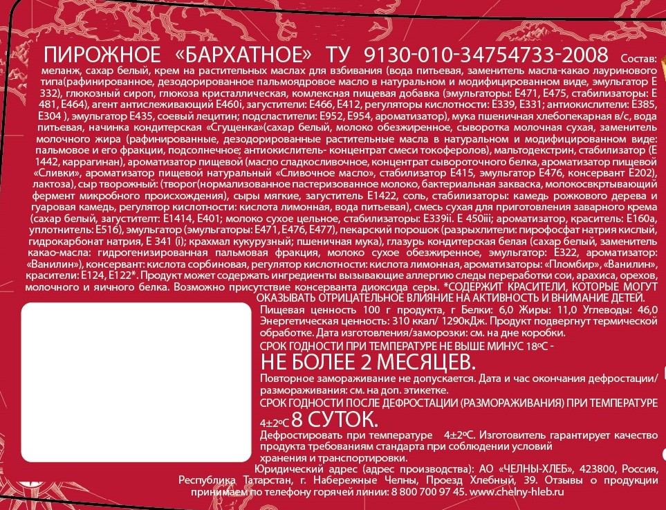 Меланж, сахар белый, крем на растительных маслах для взбивания вода питьевая, заменитель масла какао лауринового типа рафинированное, дезодорированное пальмоядровое масло в натуральном и модифицированном виде, эмульгатор Е332, глюкозный сироп, глюкоза кристаллическая, комплексная пищевая добавка эмульгаторы: Е471, Е475, стабилизаторы: Е481, Е464, агент антислеживающий Е460i, загустители: Е466, Е412, регуляторы кислотности: Е339, Е331; антиокислители: Е385, Е304, эмульгатор Е435, соевый лецитин; подсластители: Е952, Е954, ароматизатор, мука пшеничная хлебопекарная, вода питьевая, начинка кондитерская Сгущенка сахар белый, молоко обезжиренное, сыворотка молочная сухая, заменитель молочного жира рафинированные, дезодорированные растительные масла в натуральном и модифицированном виде: пальмовое и его фракции, подсолнечное; антиокислитель концентрат смеси токоферолов, мальтодекстрин, стабилизатор Е1442, каррагинан, ароматизатор пищевой масло сладкосливочное, концентрат сывороточного белка, ароматизатор пищевой Сливки, ароматизатор пищевой натуральный Сливочное масло, стабилизатор Е415, эмульгатор Е476, консервант Е202, лактоза, сыр творожный: творог, нормализованное пастеризованное молоко, бактериальная закваска, молокосвертывающий фермент микробного происхождения, сыры мягкие, загуститель Е1422, соль, стабилизаторы: камедь рожкового дерева и гуаровая камедь, регулятор кислотности: кислота лимонная, вода питьевая, смесь сухая для приготовления заварного крема сахар белый, загуститель: Е1414, Е401; молоко сухое цельное, стабилизаторы: Е339ii, Е450iii; ароматизатор, краситель: Е160а, уплотнитель: Е516, эмульгатор эмульгаторы: Е471, Е476, Е477, пекарский порошок.
