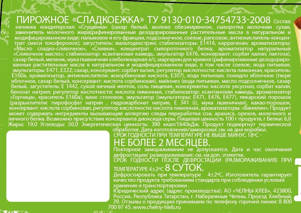 Начинка кондитерская Сгущенка сахар белый, молоко обезжиренное, сыворотка молочная сухая, заменитель молочного жира рафинированные дезодорированные растительные масла в натуральном и модифицированном виде: пальмовое и его фракции, подсолнечное, соевое, рапсовое, антиокислитель-концентрат смеси токоферолов; загуститель: мальтодекстрин; стабилизаторы: Е1414, каррагинан; ароматизаторы: Масло сладко-сливочное, Сливки, концентрат сывороточного белка; ароматизатор натуральный Сливочное масло; стабилизатор: ксантановая камедь, эмульгатор Е476, консервант: сорбат калия; лактоза, сахар белый, меланж, мука пшеничная хлебопекарная, маргарин для кремов рафинированные дезодорированные растительные масла в натуральном и модифицированном виде, в том числе соевое, вода питьевая, эмульгаторы: Е471, Е322; сахар, консервант: сорбат калия, регулятор кислотности: кислота лимонная, краситель: Е160а, ароматизатор, антиокислители: аскорбиновая кислота, Е307, вода питьевая, повидло яблочное пюре яблочное, сахар белый, консервант: кислота сорбиновая, майонез вода питьевая, масло подсолнечное, сахар белый, загуститель: Е1442, сухой яичный желток, соль пищевая, консерванты: кислота уксусная, сорбат калия, бензоат натрия; регулятор кислотности: кислота лимонная, стабилизатор: ксантановая камедь, ароматизатор Горчица, краситель Е160а, вино столовое, эмульгатор эмульгаторы: Е471, Е476, Е477, пекарский порошок разрыхлители: пирофосфат натрия, гидрокарбонат натрия, Е341i, мука пшеничная, какао-порошок, консервант: кислота сорбиновая, регулятор кислотности: кислота лимонная, ароматизаторы: Ванилин.