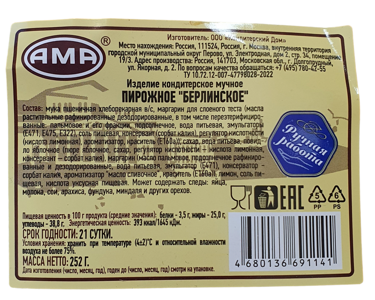 Пирожное Берлинское Ама, 252 г – оригинальное лакомство, которое изготовлено по традиционной рецептуре. Для приготовления используются пшеничная мука высшего сорта и нежное яблочное повидло. Пирожное имеет притягательный аромат и удивительный вкус с нотками кислинки. Десерт не содержит генно-модифицированных компонентов. Слоеное тесто отличается воздушностью. Оно пропитано сочной ароматной начинкой, а сверху лимонным джемом и нежной глазурью. Пирожное не рассыпается. Прекрасно сочетается с чаем или кофе.
