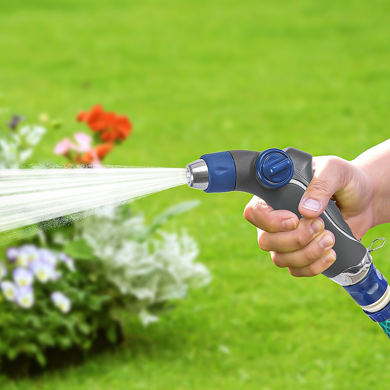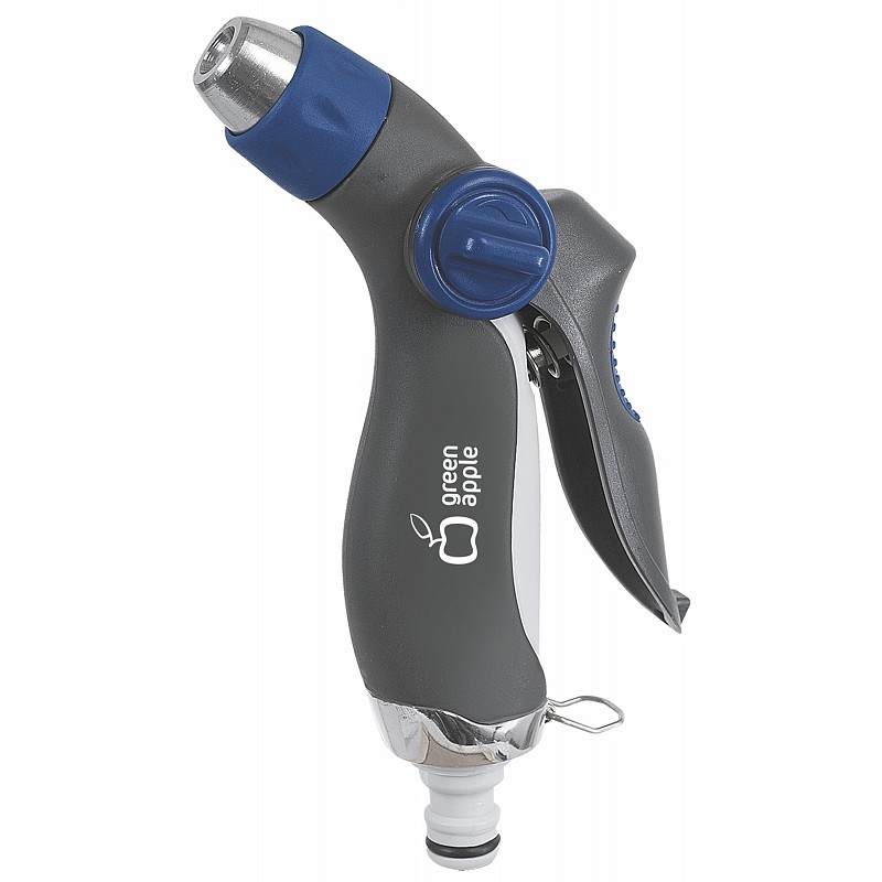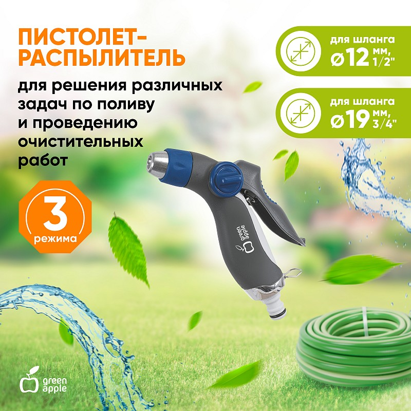 Пистолет-распылитель Green Apple 3 режима, 23,5 см предназначен для эффективного и быстрого полива сада, газонов, клумб, оранжереи или парника. Чаще всего он используется на огороде или в саду дачного участка. Все функции прибора подходят для качественного орошения, ухода за рабочим инвентарем, очищения дорожек, террас, тротуара от любых загрязнений. Модель получила несколько опций работы, поэтому максимально удобная и продуктивная в эксплуатации. Пистолет подключается к поливочному шлангу с помощью коннекторов. Он снабжается регулятором изменения интенсивности струи и специальным фиксатором для долгого полива грядок. Пистолет-распылитель эргономичной формы комфортно удобно держать в руке. Он не утяжеляет ее, не выскальзывает в процессе полива. Устройство изготовлено из прочных и надежных материалов (ABS-пластика, термопластичной резины, стали, полиоксиметилена). Все они устойчивы к внешним негативным факторам: влаге, пыли, коррозии, ультрафиолету, незначительным механическим повреждениям и ударам. Прорезиненная рукоятка с упорами для пальцев не дает рукам устать даже при длительных садовых работах. Подача воды происходит только после нажатия на курок, что значительно экономит ресурс. После эксплуатации прибор необходимо дополнительно промыть, высушить и хранить в сухом, защищенном от солнца месте.