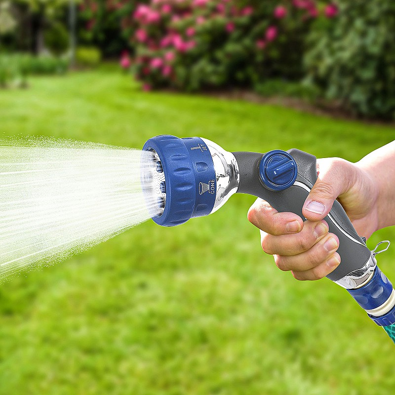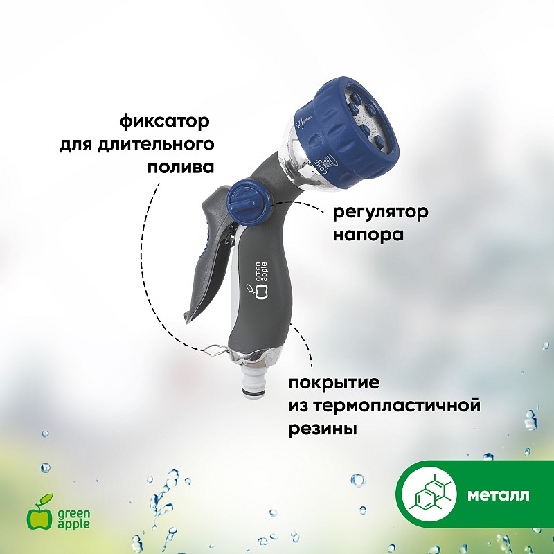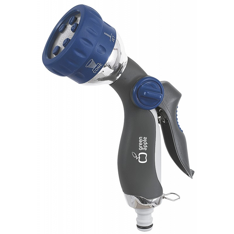 Пистолет-распылитель Green Apple 6 режимов, 25 см предназначен для эффективного и быстрого полива сада, газонов, клумб, оранжереи или парника. Чаще всего он используется на огороде или в саду дачного участка. Все функции прибора подходят для качественного орошения, ухода за рабочим инвентарем, очищения дорожек, террас, тротуара от любых загрязнений. Модель получила несколько опций работы, поэтому максимально удобная и продуктивная в эксплуатации. Пистолет подключается к поливочному шлангу с помощью коннекторов. Он снабжается регулятором изменения интенсивности струи и специальным фиксатором для долгого полива грядок. Пистолет-распылитель эргономичной формы комфортно удобно держать в руке. Он не утяжеляет ее, не выскальзывает в процессе полива. Устройство изготовлено из прочных и надежных материалов (ABS-пластика, термопластичной резины, стали, полиоксиметилена). Все они устойчивы к внешним негативным факторам: влаге, пыли, коррозии, ультрафиолету, незначительным механическим повреждениям и ударам. Прорезиненная рукоятка с упорами для пальцев не дает рукам устать даже при длительных садовых работах. Подача воды происходит только после нажатия на курок, что значительно экономит ресурс. После эксплуатации прибор необходимо дополнительно промыть, высушить и хранить в сухом, защищенном от солнца месте.